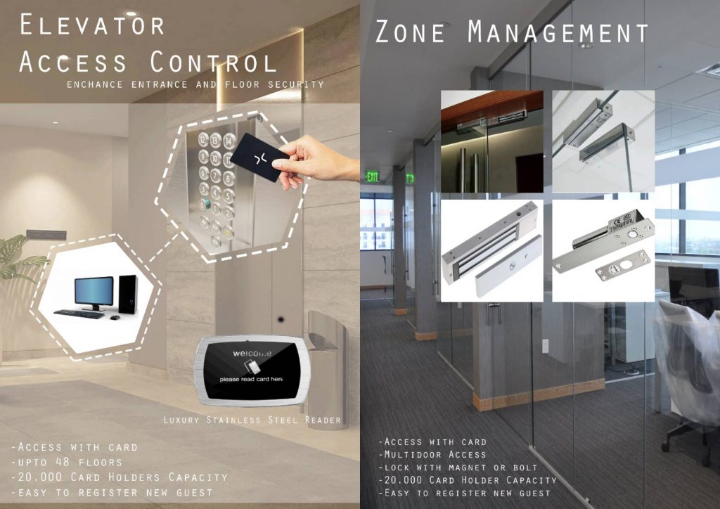 SJEC memberikan solusi untuk akses keamanan lift maupun multi pintu (door zone) di gedung perkantoran, hotel maupun rumah pribadi melalui sistem Access Control dan Zone Management yang dapat terintegrasi langsung dengan lift di tempat Anda. Pengontrol lantai dioperasikan secara bersamaan dengan sistem lift yang hanya dapat diakses melalui kartu akses universal dengan keamanan berteknologi tinggi, serta manajemen perangkat lunak sehingga aman dalam operasional namun mudah dalam penggunaanya. Kami juga menyediakan sistem biometrik, kontrol akses sistem lift stand alone (komputer off line) ataupun jaringan (komputer on line), serta manajemen akses pintu ruangan yang dapat terintegrasi menjadi satu sistem otomatis gedung.