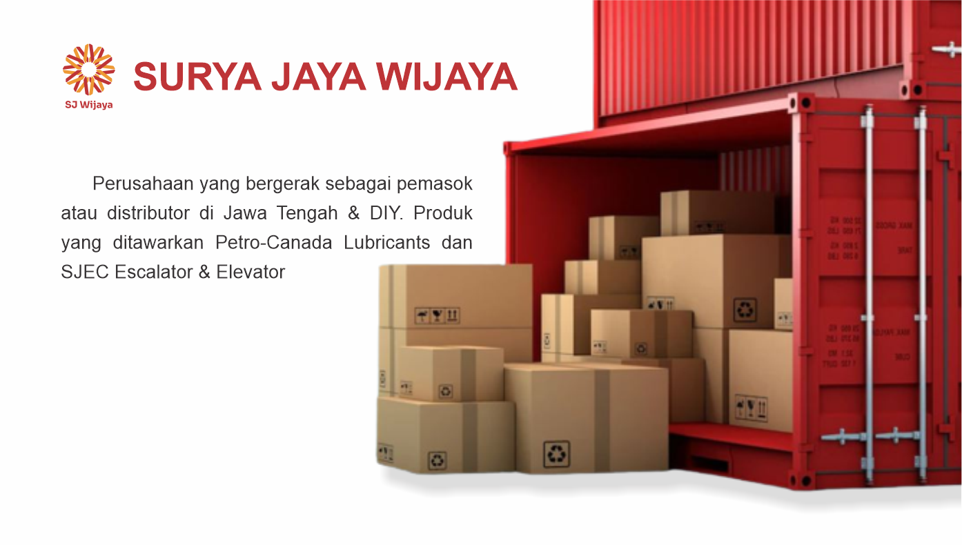 Surya Jaya Wijaya adalah perusahaan perdagangan umum yang berbasis di Solo Baru, Jawa Tengah. Perusahaan kami saat ini fokus melayani penyediaan produk, di antaranya Pelumas Industri Petro Canada dan Elevator & Eskalator SJEC